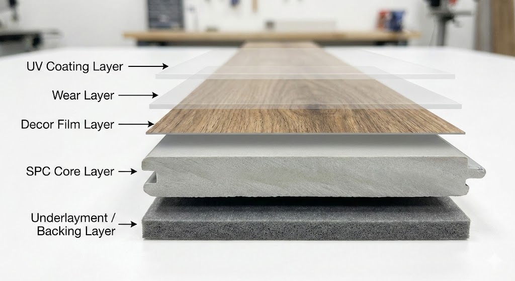 โครงสร้างของพื้น SPC นั้นมีความซับซ้อนกว่าที่เห็นภายนอก โดยปกติจะประกอบด้วย 5 ชั้นหลัก ที่ถูกอัดประสานเข้าด้วยกัน ซึ่งในแต่ละชั้นมีหน้าที่เฉพาะตัวที่แตกต่างกัน นี่คือส่วนประกอบจากชั้นบนสุดลงไปล่างสุดครับ: