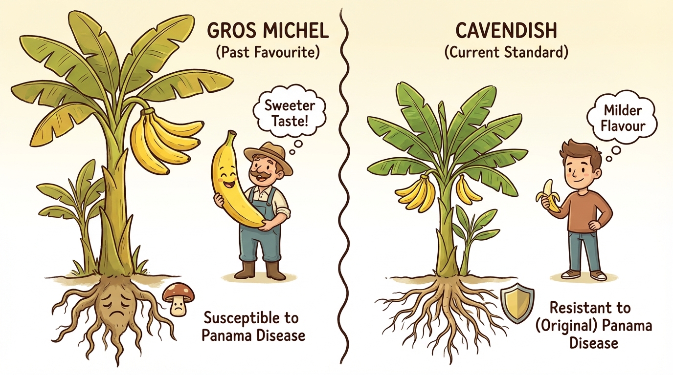 ในอดีตกล้วยหอมทอง (Gros Michel) เคยเป็นพันธุ์หลักที่ส่งออกไปทั่วโลก แต่ในช่วงปี 1950 เกิดการระบาดของ โรคตายพราย (Panama Disease) ซึ่งทำลายสวนกล้วยหอมทองราบเป็นหน้ากอง จนผู้ผลิตรายใหญ่ต้องเปลี่ยนมาปลูก คาเวนดิช แทน เพราะทนทานต่อโรคนั้นได้ดีกว่า