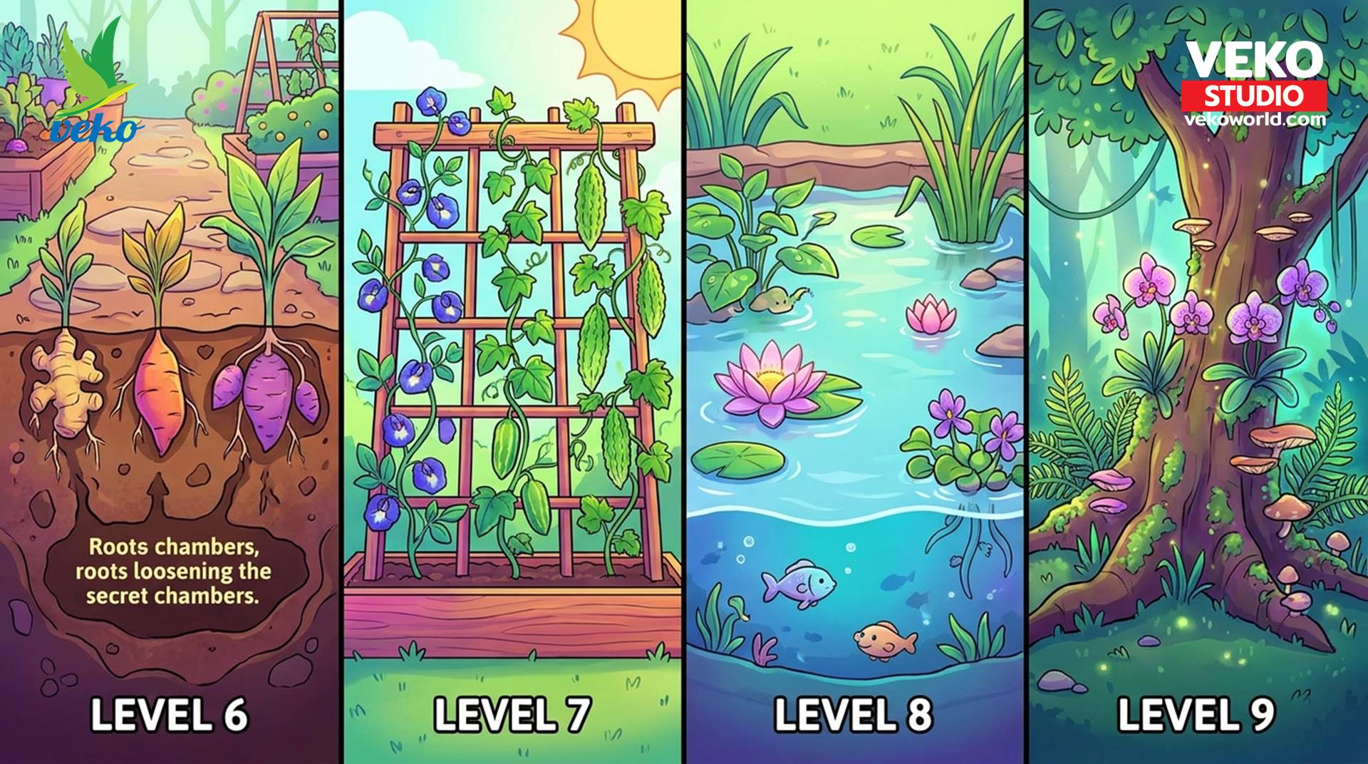 • ระดับที่ 8: พืชน้ำ (Aquatic Plants) หากมีร่องน้ำหรือบ่อปลา เราจะปลูกบัว, ผักกระเฉด, ผักตบชวา ช่วยบำบัดน้ำและสร้างที่อยู่ให้สัตว์น้ำ