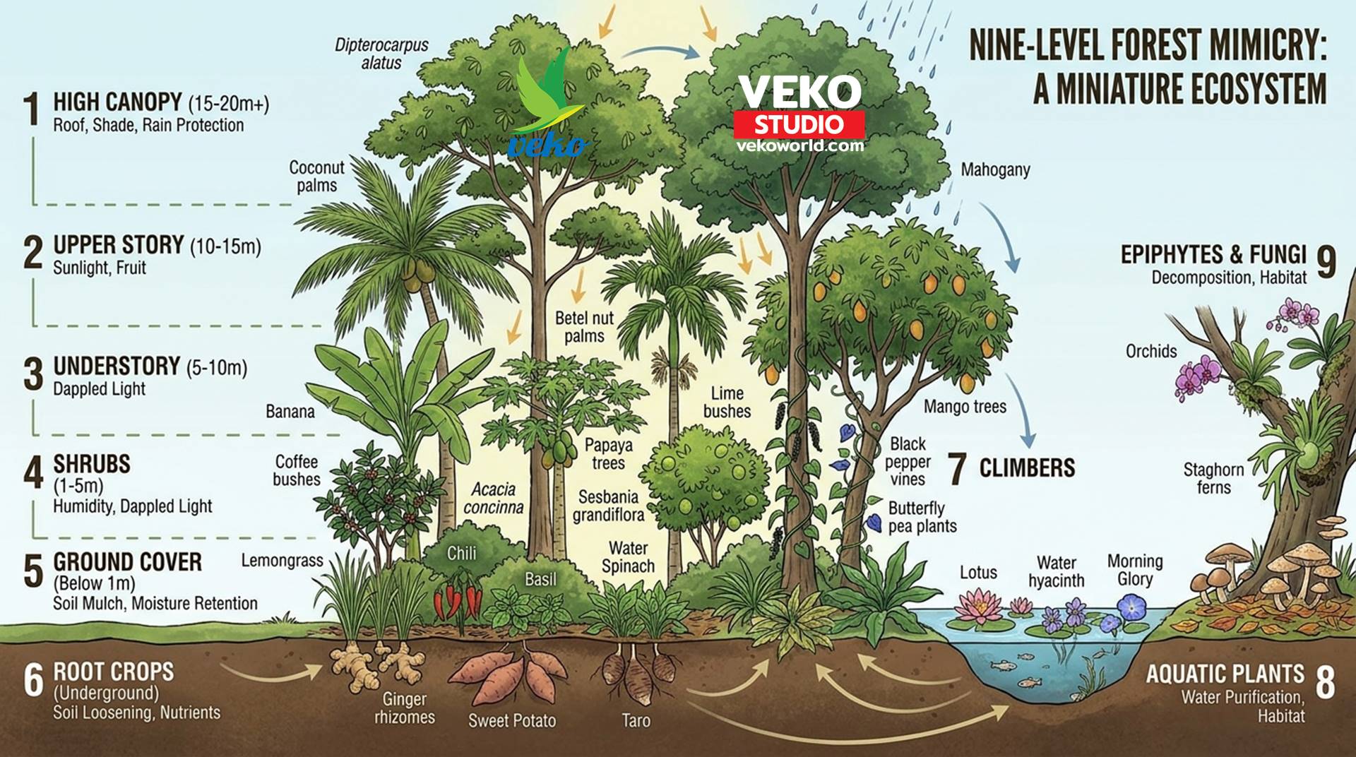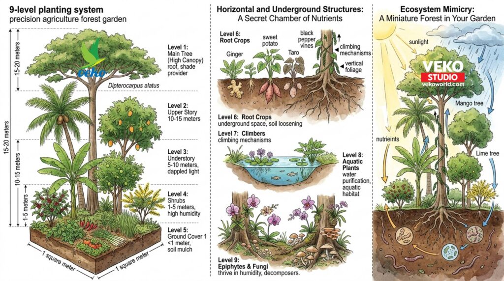 การปลูกพืชแบบ 9 ระดับ (หรือเกษตรประณีต) ไม่ใช่แค่การเอาต้นไม้มาปลูกรวมกันนะครับ แต่มันคือการ “เลียนแบบป่า” โดยใช้หลักการจัดการแสงและพื้นที่แนวตั้งให้เกิดประโยชน์สูงสุด เหมือนกับการสร้างระบบนิเวศจำลองในสวนของเราเอง