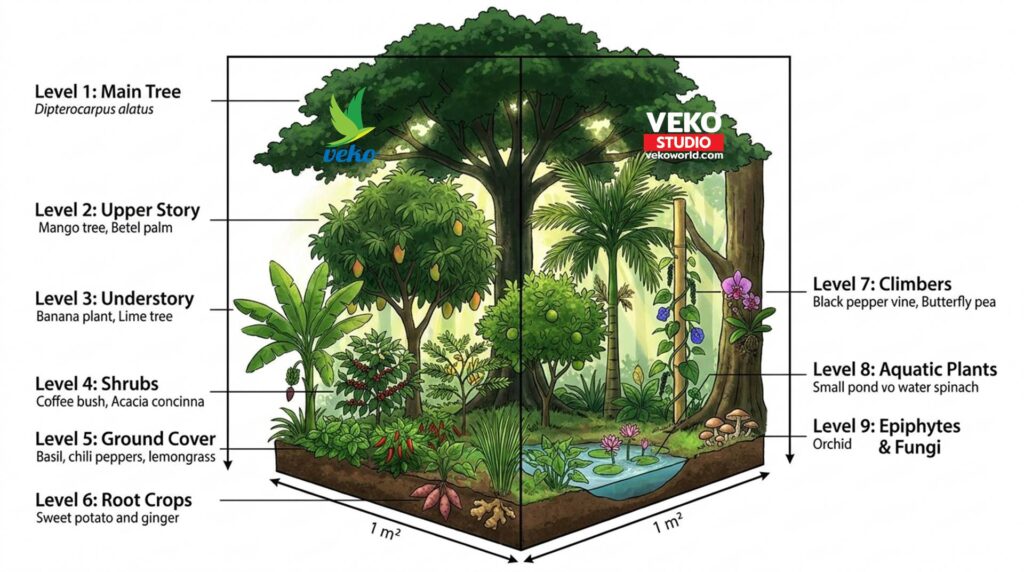 ในพื้นที่ 1 ตารางเมตร เราไม่ได้ปลูกแค่ต้นเดียว แต่เราแบ่ง “ชั้นที่อยู่อาศัย” ตามความสูง: