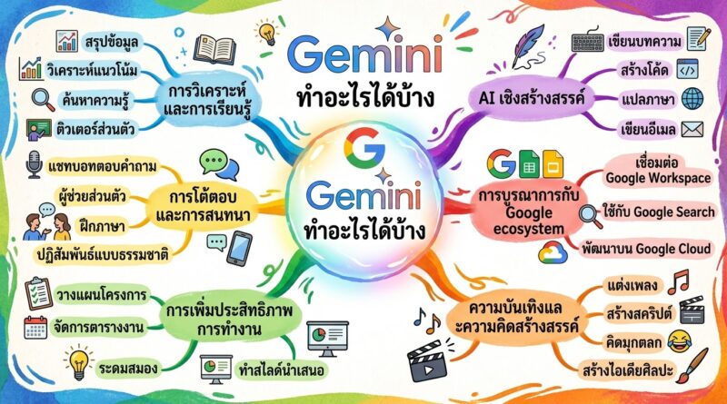 Gemini คือ AI อัจฉริยะที่ช่วยคุณ คิด วิเคราะห์ สร้างสรรค์งาน (ข้อความ/ภาพ/วิดีโอ/โค้ด) และ จัดการงานในชีวิตประจำวัน ผ่านการเชื่อมต่อกับแอป Google ได้อย่างไร้รอยต่อครับ แผนผังความคิดนี้จัดกลุ่มความสามารถของ Gemini ออกเป็น 6 ด้านหลัก เพื่อให้เห็นภาพรวมที่ชัดเจน: แผนผังความคิดนี้ช่วยแสดงให้เห็นว่า